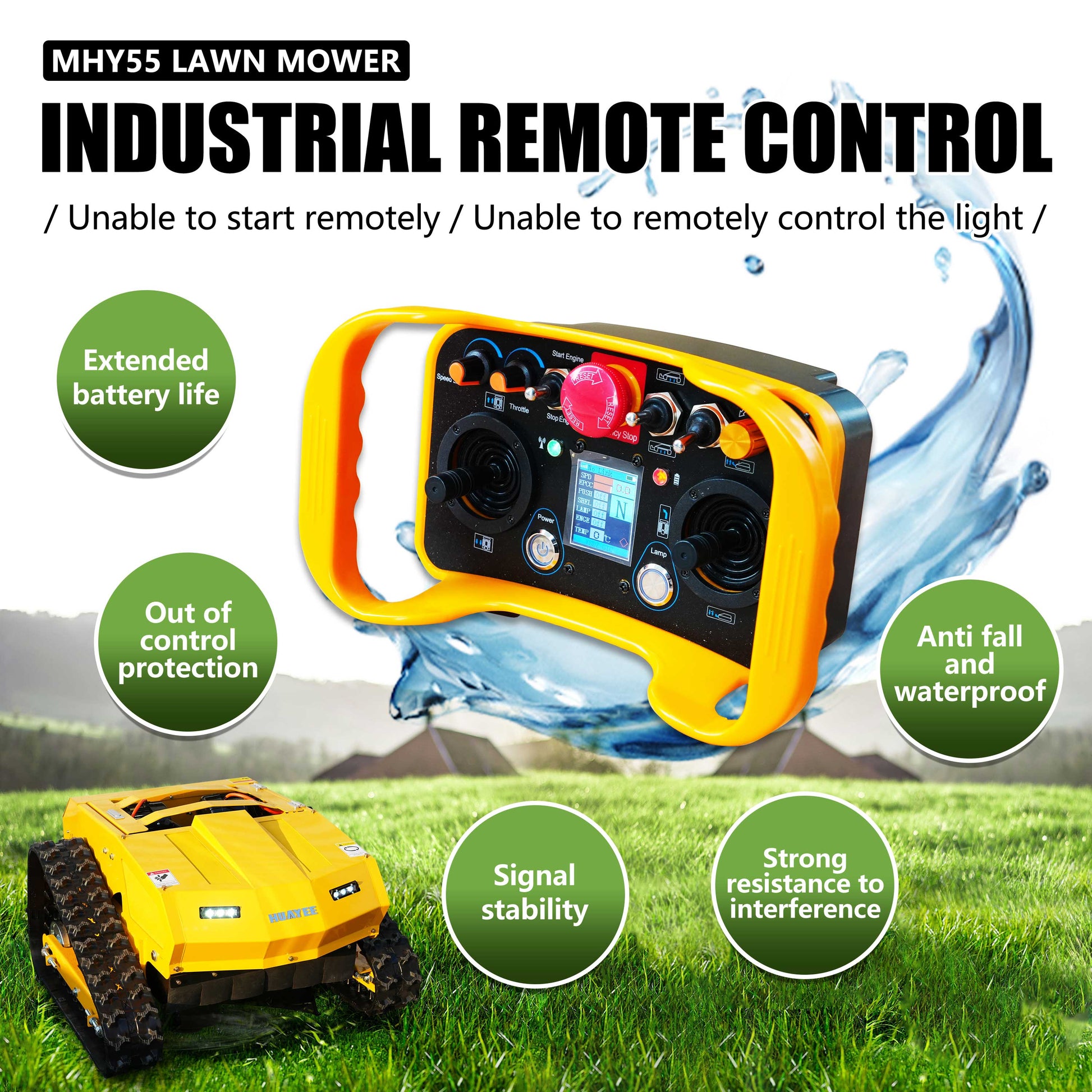 Maintain orchards and slopes easily with the MHY55 Remote Control Lawn Mower. Features a 9HP LONCIN engine, 550mm cutting width, and 200m control distance.